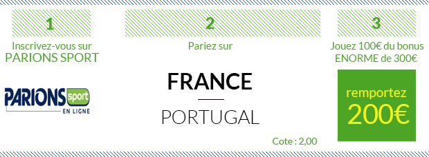 Vous pouvez par exemple miser avec votre premier pari remboursé de 100€ sur la victoire de la France face au Portugal pour tenter de remporter 285€. Si votre pari est perdant, il sera remboursé et vous aurez toujours accès à des bonus de 150€ de mises remboursés sur les paris suivants (10% des mises paris sportifs hors 1er pari) et de 100€ pour jouer sur les grilles de matchs (10% de vos mises grilles offertes).