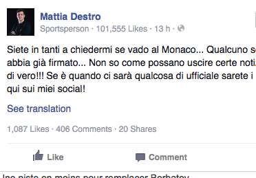 Annoncé du côté de la principauté ces derniers temps, Mattia Destro, attaquant de la Roma prêté au Milan AC la saison dernière, a tenu à faire taire toutes les rumeurs sur son compte Facebook.