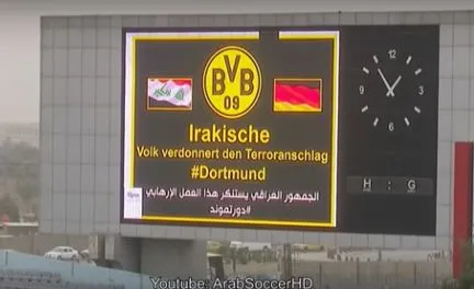 Ce jeudi, le match entre Zawra’a Bagdad et Naft Al Wasat, qui comptait pour la vingt-sixième journée de Premier League irakienne, a été marqué par un hommage à l’attaque du bus de Dortmund survenue en début de semaine. Peu avant la rencontre, les joueurs des deux équipes se sont rassemblés autour du rond central pour une minute de silence, pendant que le panneau d’affichage affichait, en allemand, un message de soutien en direction de l’Allemagne : « Le peuple irakien condamne l’attaque terroriste de Dortmund. »