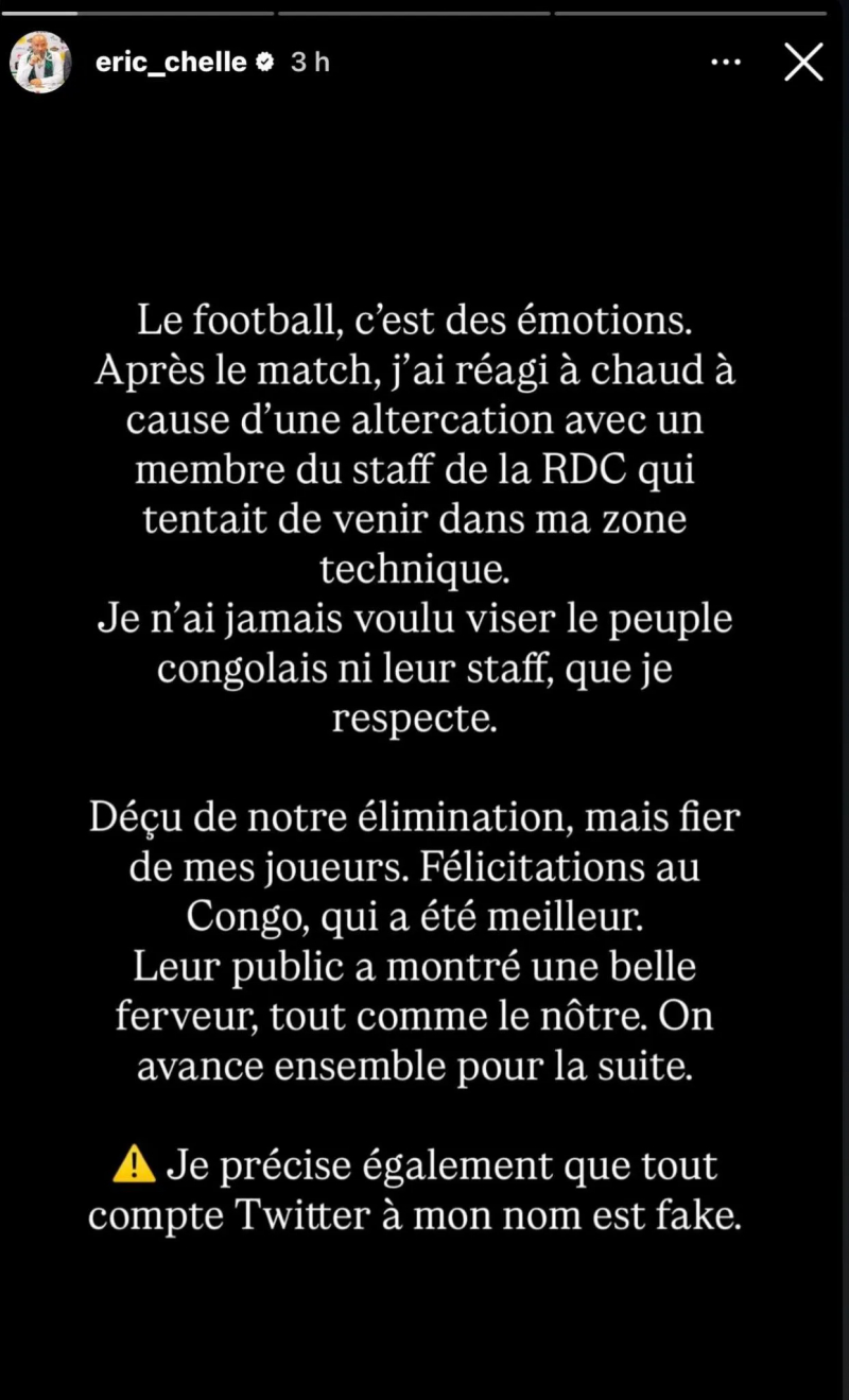 Dans une story sur Instagram, l’entraîneur malien a tenu à présenter ses excuses : « Le football, c’est des émotions. Après le match, j’ai réagi à chaud à cause d’une altercation avec un membre du staff de la RDC, qui tentait de venir dans ma zone technique. Je n’ai jamais voulu viser le peuple congolais ni leur staff, que je respecte. »