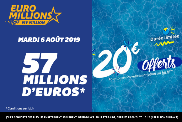 La cagnotte de l'EuroMillions dépasse la barre des 50 millions d'euros et affiche même 57 millions à gagner en ce mardi 6 août 2019. En vous inscrivant sur FDJ.fr, vous pouvez obtenir un bonus de 20€ et prendre 8 grilles d'EuroMillions aux frais de la FDJ
