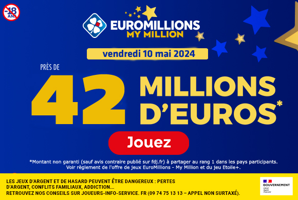 L’EuroMillions affiche donc 42 millions d’euros ce vendredi 10 mai 2024. Une cagnotte à jouer en ligne exclusivement sur FDJ.fr !