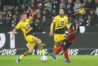 Pourtant, ce sont bien les visiteurs qui ouvrent les hostilités. Peu avant le premier quart d’heure, Mario Götze, ancien de la maison, punit son ex d’une volée du droit, après qu’Alexander Meyer s’est pourtant interposé face à une première tentative signée Omar Marmoush. Mais la domination écrasante du Borussia (70% de possession en première mi-temps) est justement récompensée après la demi-heure de jeu grâce à Karim Adeyemi, lequel reprend sereinement un centre adressé par Malen au second poteau. Au retour des vestiaires, hormis une frappe trop molle de Niels Nkounkou, l’Eintracht ne parvient pas à reprendre les commandes et se fait logiquement punir par un coup de casque plongeant de Mats Hummels, sur un service de Julian Brandt.