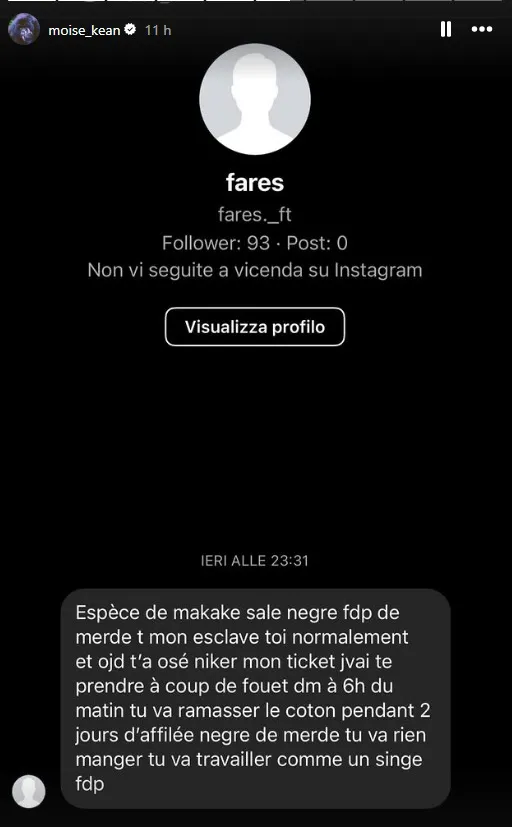 Sur celui de Kean, c’est un florilège : « nègre », « Ce soir, tu ne danses pas, sale singe », « il n’y a pas de noirs italiens », « Tu es mon esclave toi normalement et tu as osé niq*** mon ticket de paris, je vais te prendre à coups de fouet demain à 6 heures du matin et tu vas ramasser du coton pendant deux jours d’affilée. »