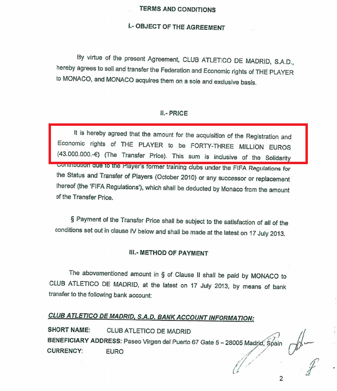 Lancé mardi 29 septembre, FootLeaks rend public des documents classés confidentiels. Un vrai pavé dans la mare. Ainsi, ce vendredi, quatre pages du contrat du transfert de Radamel Falcao de l’Atlético vers Monaco en 2013 sont révélées. Surprise, on y apprend que le club monégasque a dépensé non pas 60, mais 43 millions d’euros, payés en une fois par l’ASM.
