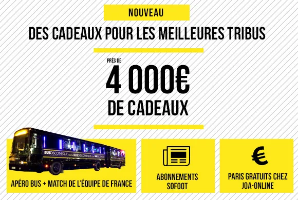 Les meilleures équipes au classement général seront récompensées : – 1ere tribu : 1 soirée Apéro Bus + match amical de l’Equipe de France à vivre avec l’ensemble de la tribu à l’automne 2016 à Paris – 2ème tribu : 1 abonnement d’1 an à So Foot + Bonus Joa 20€ pour chaque membre de la tribu- 3ème tribu : 1 abonnement d’1 an à So Foot + Bonus Joa 10€ pour chaque membre de la tribu – 4ème tribu : 1 abonnement d’1 an à So Foot pour chaque membre de la tribu- 5ème tribu : Bonus Joa 10€ pour chaque membre de la tribu