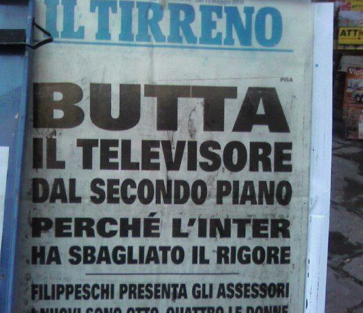 La saison de l’Inter va au moins faire un heureux : le vendeur de télévisions de la ville de Livourne.En effet, samedi soir, un drôle d’épisode a eu lieu chez un tifoso nerazzurro vivant justement à Livourne. Au moment où Giampaolo Pazzini rate le pénalty de l’égalisation contre l’Udinese, à la dernière minute de jeu, ce supporter pète littéralement un câble. Il saisit son téléviseur, et le balance par la fenêtre. Celui-ci fait un vol plané de deux étages et s’écrase par terre. Par chance, personne ne passait par là à ce moment là.Ce n’est pas la première fois qu’un tel événement se produit. En mai 2008, Marco Materazzi rate un pénalty qui aurait offert le Scudetto à l’Inter, lors de l’avant-dernière du championnat. Un tifoso habitant à Pise avait alors balourdé son écran 28 pouces par la fenêtre.Conclusion : soit les fans de l’Inter sont plus tarés que les autres, soit ils ont des bonnes relations chez Samsung.