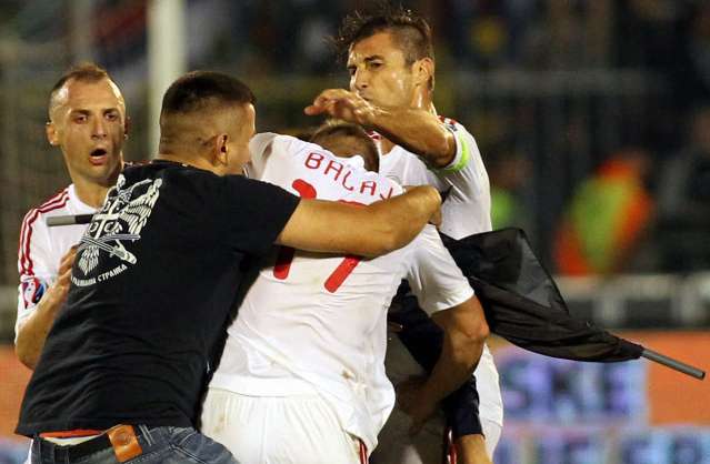 Un des deux autobus qui transportaient l’équipe serbe vers Tirana, où se déroulera la rencontre, a été la cible de jets de pierres. Si aucun joueur ou membre de la délégation n’a été blessé, cet acte a été fermement dénoncé par le ministre des Sports et la Fédération serbe de football, sur son site officiel : « Un de nos deux autobus a été touché par des pierres venant de gens qui se trouvaient le long de la route depuis l’aéroport vers notre hôtel. Si des jets de pierres sont possibles à Tirana, je me demande ce qui nous attend demain sur la route d’Elbasan. »