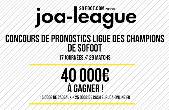Pour s’inscrire et tout savoir sur la joa-league par So Foot (dotations complètes, règles du jeu détaillées, etc.), rendez-vous sur http://joa-league.sofoot.com