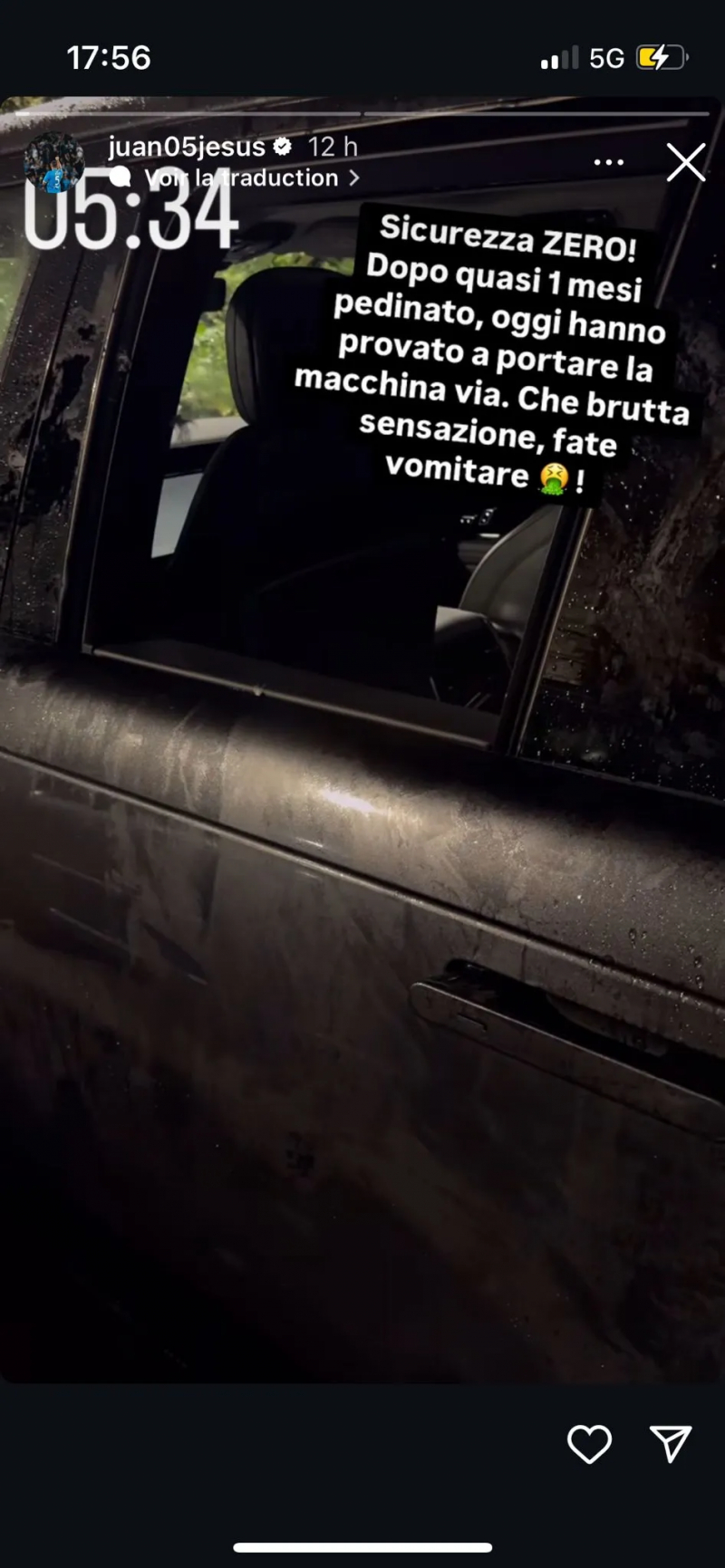 Dans une story Instagram, Jesus dévoile au petit matin sa voiture complètement saccagée, ajoutant « sécurité zéro. Après presque un mois de filature, ils ont essayé aujourd’hui de prendre ma voiture. Quel horrible sentiment, vous faites vomir ».