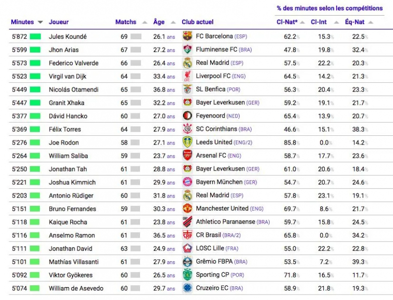 Le podium est complété par le Colombien Jhon Arias (Fluminense, 5 599 minutes en 67 matchs disputés) et l’Uruguayen du Real Madrid Federico Valverde (5 573 minutes en 66 rencontres). Dix-septième, l’attaquant du LOSC Jonathan David (5 111 minutes en 63 matchs) est le seul représentant de Ligue 1 présent dans le top 20, au sein duquel figure également un autre Français, William Saliba (dixième avec 5 264 minutes en 59 apparitions).