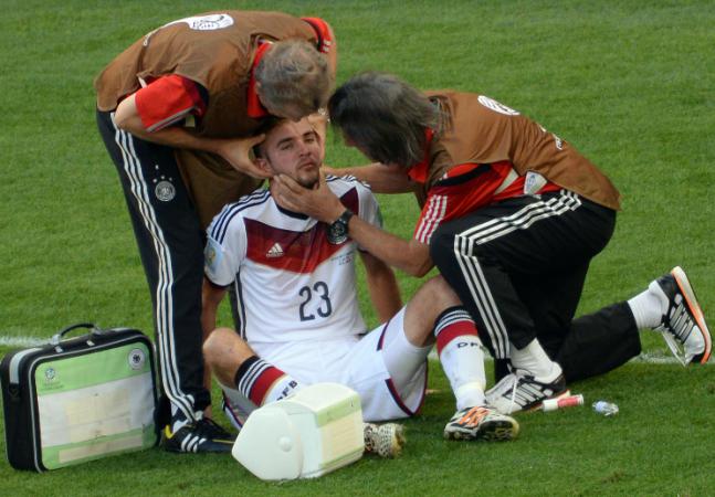 Le staff médical de la Nationalmannschaft redoute une commotion cérébrale pour ce jeune joueur de 23 ans. Mamie attendra sans doute un peu pour le bisou.