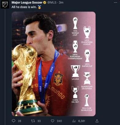 Nouveau joueur de l’Inter Miami, Sergio Busquets a eu droit à tous les honneurs de la part de son club et de la Major League Soccer à travers les différentes plateformes digitales possibles. Problème, les community managers de la MLS sont allés un peu trop loin en confondant le milieu de terrain et Álvaro Arbeloa. Sur une photo de présentation, légendée d’un « tout ce qu’il sait faire, c’est gagner » en hommage aux trophées remportés par l’ancien Barcelonais, apparaît en effet un cliché du latéral madrilène. Et si l’erreur a rapidement été réparée, elle ne sera pas passée inaperçue.