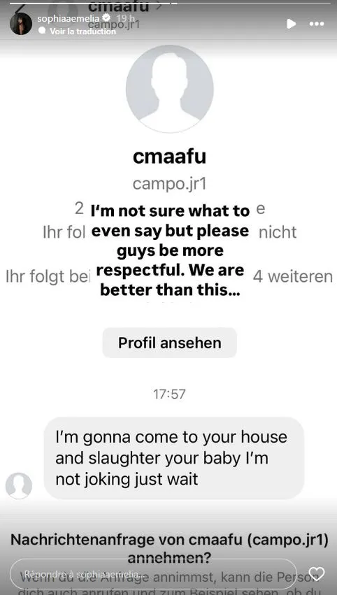 En story Instagram, elle a partagé deux des messages qu’elle a reçus : « J’espère que tu feras une fausse couche », pour le premier, et « Je vais venir dans ta maison et tuer ton bébé, je ne rigole pas, juste attends », pour le second. La femme de l’attaquant, choquée par ces propos, semblait avoir du mal à trouver les mots pour qualifier ces termes scandaleux : « Je ne suis même pas sûre de savoir quoi dire, mais s’il vous plaît, les gars, soyez plus respectueux », a-t-elle communiqué sur Instagram. La bêtise humaine n’a décidément aucune limite.