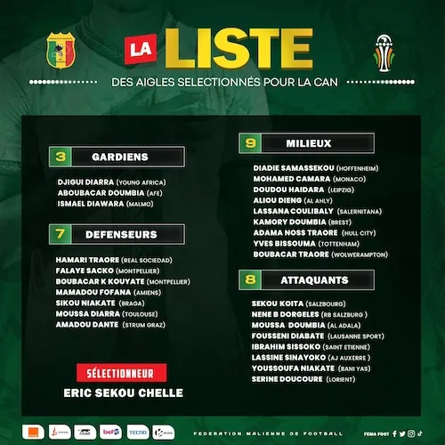 À onze jours du début de la CAN, les sélectionneurs des 24 nations engagées dévoilent peu à peu la liste des joueurs qu’ils emmèneront en Côte d’Ivoire. Ce mardi, c’était au tour du Mali de dévoiler son groupe. Pour sa première CAN, Éric Chelle a donc décidé d’emmener 27 joueurs, dont 6 qui évoluent en Ligue 1 : Falaye Sacko et Kiki Kouyaté (Montpellier), Moussa Diarra (Toulouse), Mohamed Camara (Monaco), Kamory Doumbia (Brest), et Serine Doucouré (Lorient). Mamadou Fofana (Amiens), Ibrahim Sissoko (Saint-Étienne) et Lassine Sinayoko (Auxerre) sont également là pour représenter notre belle Ligue 2.