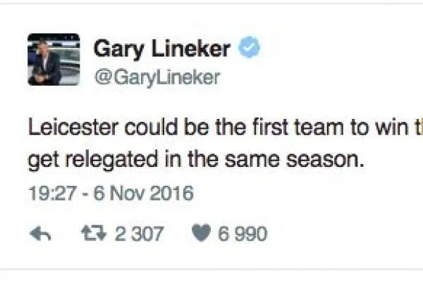 Gary Lineker est sûr de ne pas perdre, tweetant même quelques minutes plus tard que Leicester pourrait être la première équipe à remporter la Ligue des Champion tout en étant relégué la même saison.
