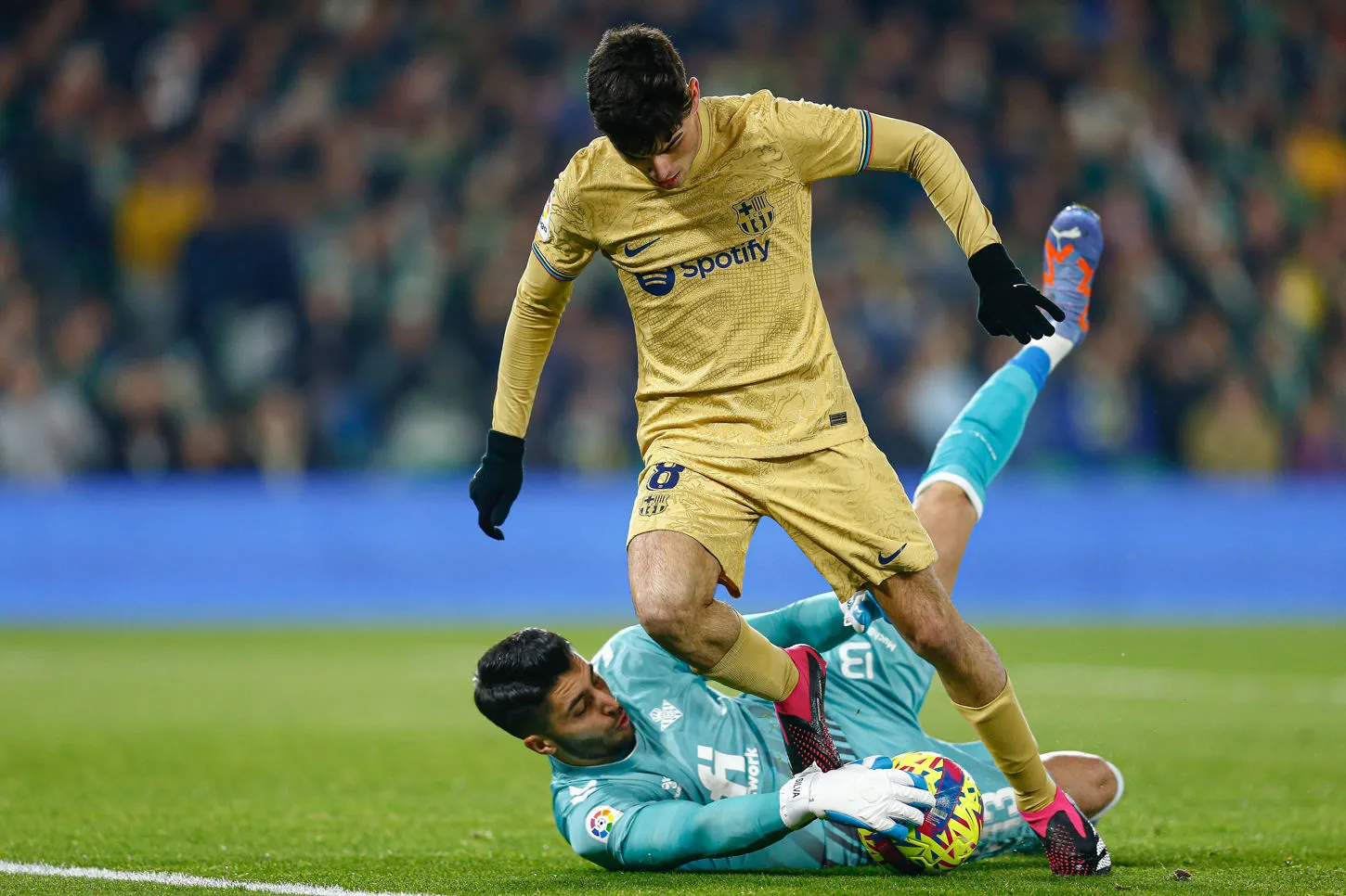 La rencontre avait pourtant débuté par deux grosses occasions verdiblancas, avec une lourde frappe de Luiz Enrique contrée (10e) puis une percée de Borja Iglesias qui réclame pénalty en tombant dans la surface (12e). 20e minute, le show Pedri démarre, et le petit numéro 8 du Barça dribble toute la défense sévillane avant de buter sur Rui Silva en bout de course. Mêmes acteurs pour un même résultat quinze minutes plus tard (36e). La doublette Gavi-Lewandowski prend la relève, avec le Polonais dans le rôle de remiseur pour une frappe à l’entrée de la surface du nouveau numéro 6 barcelonais (40e), puis une tête (43e).