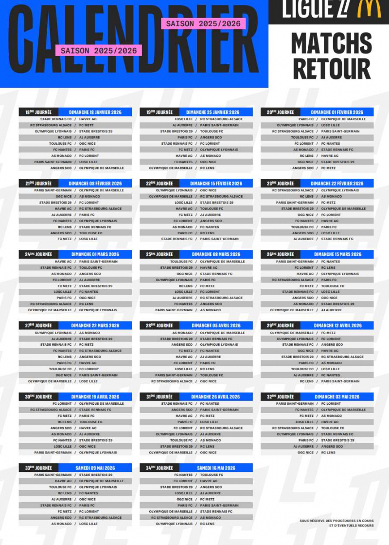 Quelques heures après la sortie des affiches de la première journée de Ligue 1, on connaît désormais le menu des 34 journées. Les 18 équipes en lice s’écharperont du week-end du 15 août 2025 au 16 mai 2026, de quoi pouvoir profiter du meilleur championnat du monde pendant neuf mois.