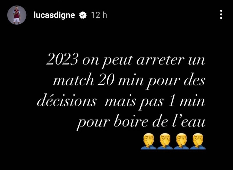 Ce samedi, Lucas Digne s’est indigné du récent refus de la FFF d’interrompre les matchs des championnats de France pour permettre aux joueurs musulmans de rompre leur jeûne, durant ce mois de ramadan. Alors qu’en Angleterre notamment, la situation est tout autre, le latéral d’Aston Villa s’est exprimé brièvement sur Instagram, à coups d’émojis dépités : « En 2023, on peut arrêter un match 20 minutes pour des décisions, mais pas une minute pour boire de l’eau. »