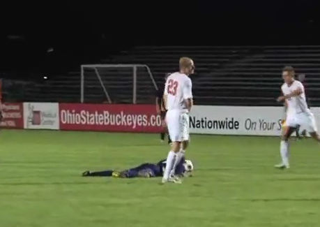 Un joueur d’Ohio fait faute sur un adversaire au sol. Intimidation à l’américaine dans la foulée. Un collègue du fautif prépare sa course d’élan et effectue une frappe de belle facture en pleine tête de l’homme à terre.