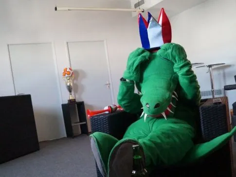 Le Nîmes Olympique a profité du match d’ouverture des Bleus pour se faire un petit kiff. Le club a publié des photos de sa mascotte, El Croco, en train de suivre la rencontre devant la télé. Confortablement installé dans son fauteuil, le crocodile picole et se gave de bonbons. Il possède l’attirail idéal du supporter : couronne bleu-blanc-rouge du meilleur goût, assiettes et gobelets tricolores, vuvuzela et jeu de cartes. Du très haut niveau.
