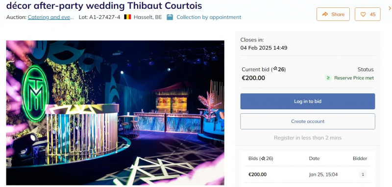 Qui, en scrollant son fil d’actu un vendredi matin d’hiver, se dit : « Tiens, j’aimerais bien recréer l’after-party du mariage de Thibaut Courtois chez moi ? » Oui, nous aussi. Pourtant, le destin vous tend enfin la main. Le site Troostwijk Auctions a mis en ligne aux enchères ce qui semble être le décor de la fête post-mariage du gardien belge. Et tout ça pour la diabolique somme de 200 euros !