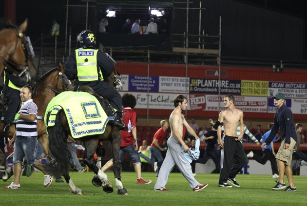 Le dernier match entre les deux ennemis voisins de Bristol remontait à 2007. Depuis, les deux équipes n’avaient jamais eu l’occasion de se rencontrer, Bristol City en League One (3e division) et Bristol Rovers en League Two (4e division) ne jouant plus au même niveau. Six ans après, lors de la Johnstone’s Paint Trophy (coupe à élimination directe ouverte aux clubs participant à la Football League One et à la Football League Two), les deux clubs ont fêté à leur manière ces retrouvailles. Le match est tendu, mais sans plus. À peine trois cartons jaunes sont distribués au cours du match. Sauf qu’au coup de sifflet final, les supporters de City décident de fêter leur victoire 2 à 1 en envahissant le stade. Ils se dirigent vers les supporters des Rovers pour les chambrer. Et eux répliquent en lançant des chaises. L’occupation du terrain dure plusieurs minutes avant que la police équestre n’intervienne. Hier, 12 personnes ont passé la nuit en garde à vue.L’amour est dans le pré.