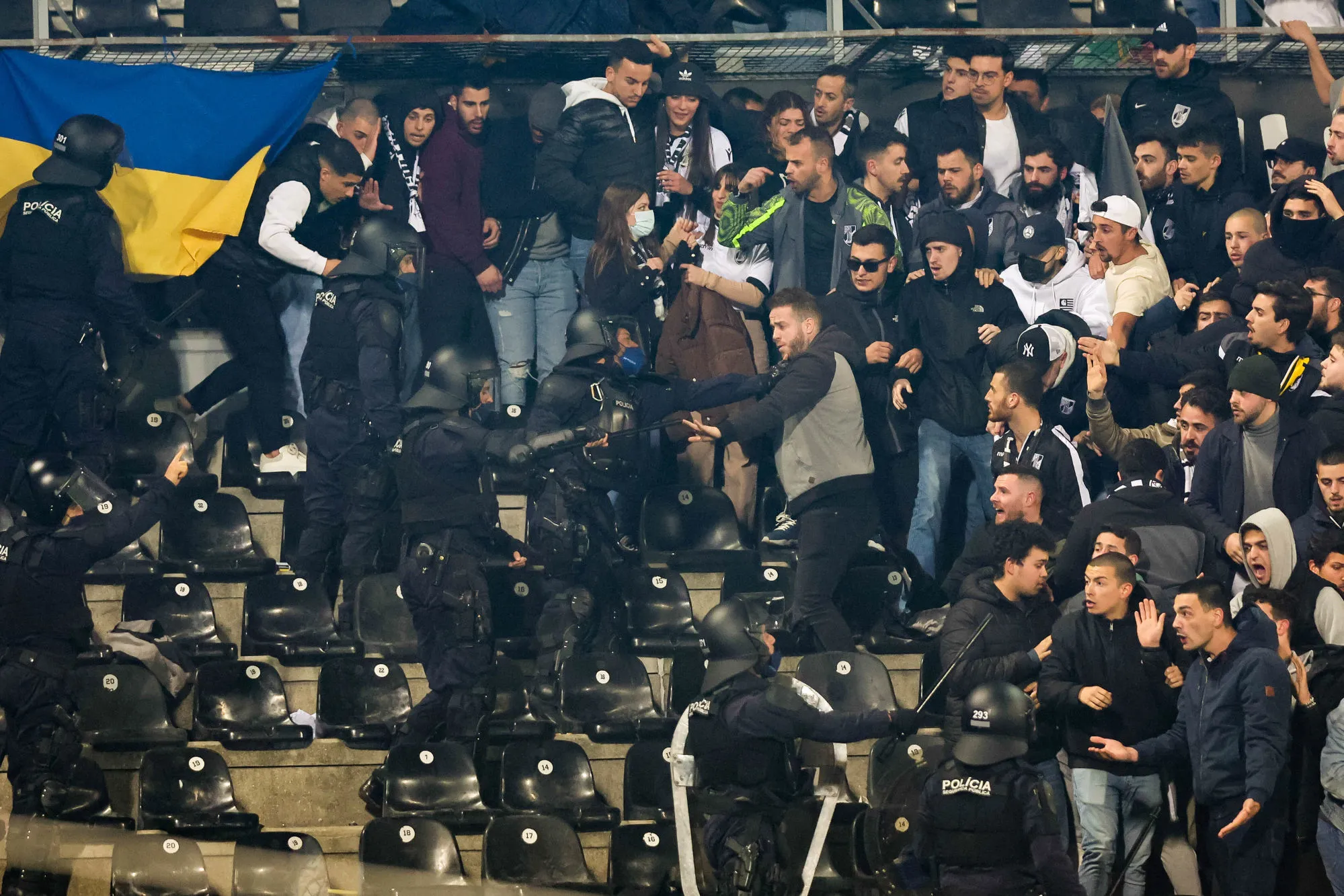 Ainsi, à la 76e, l’arbitre Fábio Veríssimo s’est vu dans l’obligation de stopper la rencontre durant plus de cinq minutes. Car en réalité, comme le montre le quotidien sportif O Jogo, un grand nombre de supporters des locaux se sont dirigés vers un même point névralgique au sommet de la tribune pour passer à tabac quelques Sportinguistas, visiblement pas présents en parcage visiteurs. Une confusion s’est alors créée, avec des centaines de spectateurs lambda paniqués s’évertuant à quitter la zone sensible. La police a ensuite investi la tribune pour maîtriser les débordements.