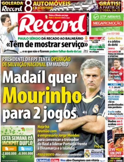 D’après le quotidien lusitanien Record, la sélection portugaise est plongée dans une telle crise que le président de la Fédération portugaise de football (FPF), Gilberto Madaíl, ne voit qu’une solution : faire appel au Special One pour 2 matches (contre le Danemark et l’Islande, les 8 et 12 octobre prochains), le temps de trouver un successeur et dans l’espoir de ne pas hypothéquer définitivement les chances de qualification pour l’Euro 2012.