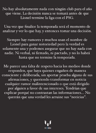 Jorge Messi a insisté sur le fait qu’aucune décision ne serait prise avant la fin la saison. « ll y a toujours des rumeurs et beaucoup utilisent le nom de Lionel pour gagner en notoriété, mais il n’y a qu’une seule vérité, et nous pouvons assurer qu’il n’y a rien avec personne. Ni verbal, ni signé, ni convenu, et il n’y en aura pas tant que la saison ne sera pas terminée. » Messi père s’en est enfin pris aux médias, en accusant « certains de tromper l’opinion de manière consciente et délibérée, sans fournir aucune preuve de leurs déclarations ».