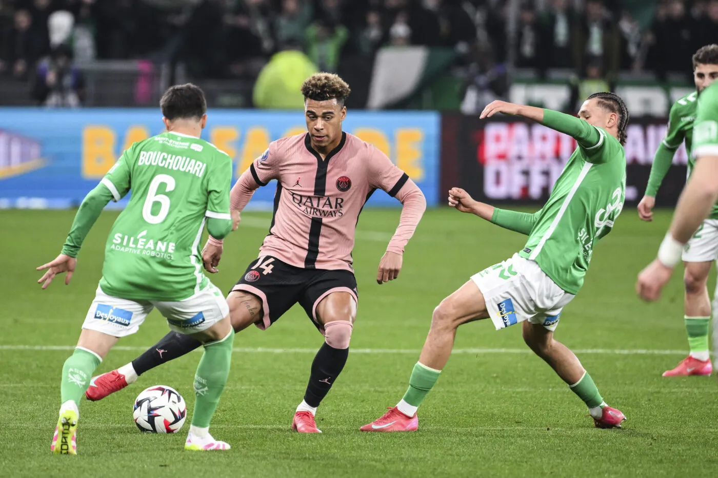 Après une journée intense dans le Forez, ce sont les Stéphanois qui démarrent très fort, croquent dans chaque duel et se projettent à 1000 à l’heure à chaque opportunité. Suffisant pour être récompensé sur un magnifique centre de Zuriko Davitashvili pour Lucas Stassin, qui trompe Matveï Safonov de la tête (1-0, 9e). Le Chaudron peut hurler son bonheur, et Luis Enrique sa colère. Bousculé comme rarement, le PSG met une bonne demi-heure à entrer dans son match, mais parvient à recoller avant la pause sur un penalty obtenu et transformé par Gonçalo Ramos, titulaire en pointe (1-1, 43e).