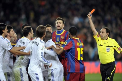 Sergio Ramos s’est en effet fait exclure dans les arrêts de jeu. L’international espagnol avait accroché Lionel Messi, et alors qu’il se dirigeait vers le Barcelonais pour s’excuser, Puyol et Xavi ont déboulé sur lui. L’ex-Sévillan a alors collé sa main dans la face de Carles Puyol, de quoi agacer Monsieur Iturralde, qui lui claque directement un rouge.