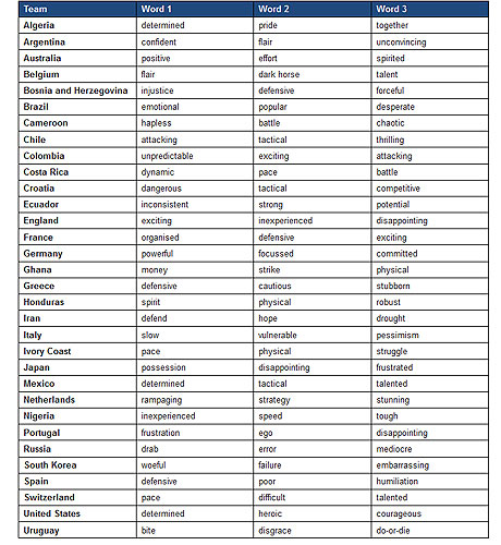 Pendant que le quidam regardait les matchs devant sa télévision ou au bar du coin, une équipe d’experts de l’université de Cambridge s’est amusée à compiler et analyser les millions de mots utilisés par les médias anglophones du monde entier pour qualifier les 32 équipes de cette Coupe du monde, rapporte le Daily Telegrah.