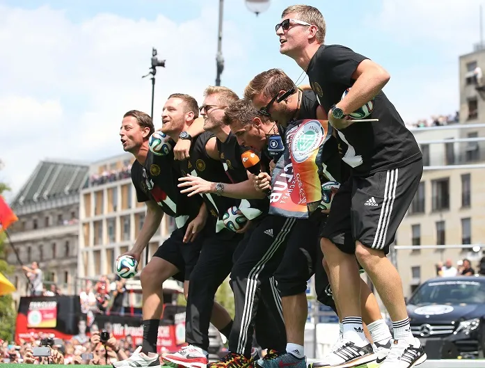 Face aux 200 000 supporters allemands réunis à Berlin, près de la porte de Brandebourg, pour les fêter en héros, les joueurs de la Nationalmannschaft avaient à cœur d’assurer le spectacle.