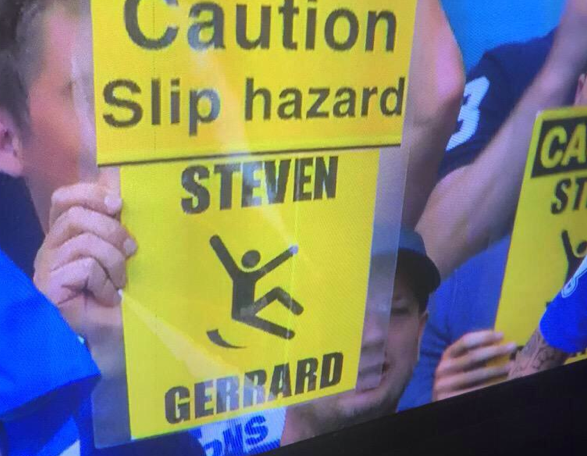 Ce dimanche après-midi, Steven Gerrard a disputé sa dernière rencontre à Stamford Bridge contre les Blues de Chelsea lors de la 36e journée de championnat. Un match où le milieu de terrain anglais aura inscrit le but égalisateur des siens. Remplacé à la 79e minute de jeu, Gerrard a eu le droit à une superbe ovation de la part du public, des entraîneurs et des joueurs. Mais certains fans londoniens ont tenu à lui offrir autre chose. Une poignée d’entre eux a agité des affiches faisant référence à sa chute de l’an dernier devant Demba Ba qui avait coûté le titre à Liverpool.