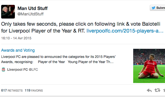 Quelques groupes de supporters de Manchester United sont en train de s’organiser pour faire de Mario Balotelli le joueur de Liverpool de l’année. Sur le site officiel des Reds, tout le monde peut aller voter pour élire le joueur de l’année. Et quelques Red Devils malins appellent à la mobilisation générale pour que le gros flop d’Anfield se retrouve tout en haut de la liste.