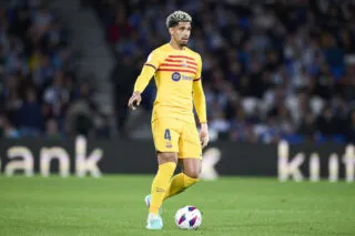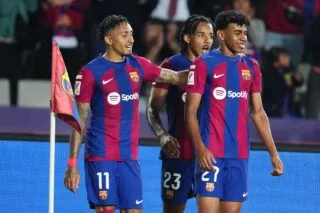 Le FC Barcelone a étalé la Real Sociedad ce dimanche à Montjuïc (4-0). Les Basques se sont tiré une balle dans le pied quand Aritz Elustondo a accroché Dani Olmo. Lancé en profondeur par Robert Lewandowski, le milieu offensif du Barça avait pris l’avantage et filait au but, alors l’arbitre a logiquement sorti le carton rouge (17e). Les Blaugrana n’ont pas tardé à en profiter : après un festival de Lamine Yamal et un ballon aérien d’Olmo, Gerard Martin a placé une reprise gagnante au deuxième poteau (1-0, 25e). Dans la foulée, la frappe d’Olmo, involontairement détournée par son coéquipier Marc Casado, a elle aussi fini au fond (2-0, 29e).