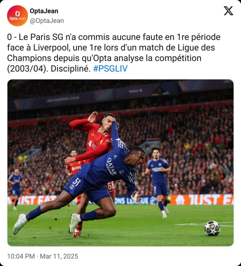 Dans le premier acte, les hommes de Luis Enrique n’ont commis aucune faute, une première en Ligue des champions depuis que les rois des statistiques analysent la compétition (2003-2004). Malgré les nombreuses vagues des coéquipiers de Mohamed Salah, la défense parisienne s’est montrée très disciplinée.