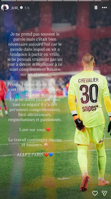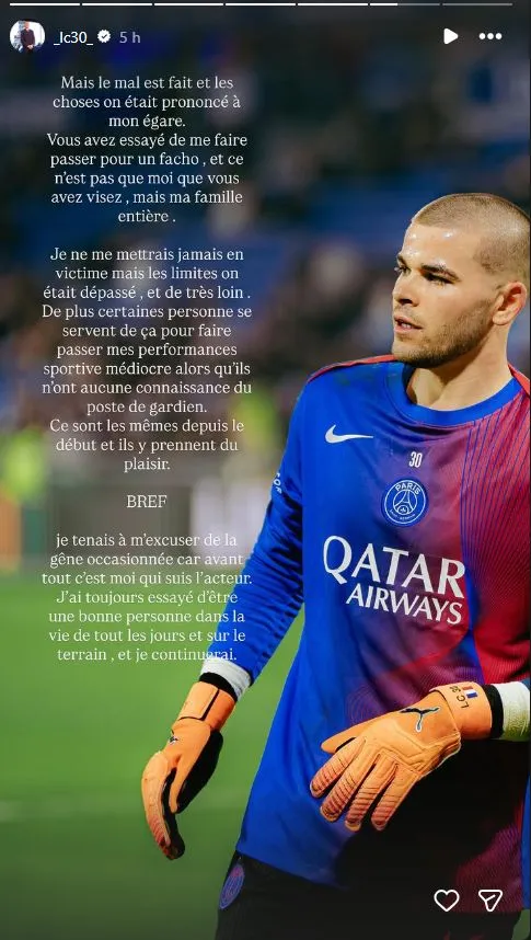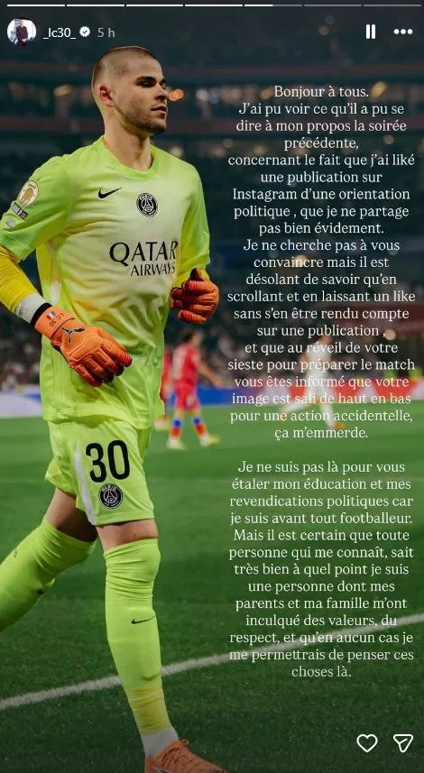 Le gardien de l’équipe de France a publié un long communiqué sur sa page Instagram, et plaide l’erreur. Il parle d’« une orientation politique qu’[il] ne partage pas, bien évidemment » et évoque un « j’aime » lâché « sans s’en être rendu compte ». « Ça m’emmerde. Il est certain que toute personne qui me connaît sait très bien à quel point mes parents et ma famille m’ont inculqué des valeurs, du respect, et qu’en aucun cas je me permettrais de penser ces choses-là. »