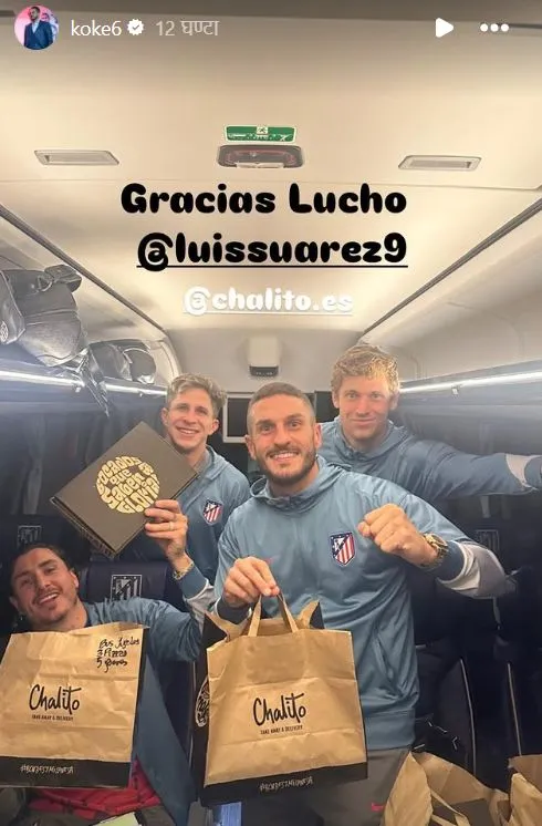 Vainqueurs dans le temps additionnel contre le FC Barcelone ce samedi (1-2), les joueurs de l’Atlético de Madrid sont repartis avec les trois points, une première place au classement de la Liga et de la malbouffe. En effet, le repas de la victoire leur a été offert par Luis Suárez, via sa chaîne de restaurants « Chalito ». Koke ou encore Marcos Llorente n’ont ainsi pas manqué l’occasion de glisser un petit coup de publicité à leur ancien coéquipier (entre 2020 et 2022, avec un championnat d’Espagne à la clé en 2021).