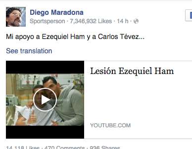 Sur son compte Facebook, il a d’abord apporté sa compassion à Ezequiel Ham. « Pour surmonter des blessures aussi sérieuses, tu dois avoir un sacré caractère, et je suis sûr que tu reviendras encore plus fort. J’ai aussi connu une blessure de ce type quand je jouais à Barcelone. Et je suis parvenu à revenir fort, en gagnant la Coupe du monde 1986. Je te souhaite un prompt rétablissement » , a expliqué El Pibe de Oro.