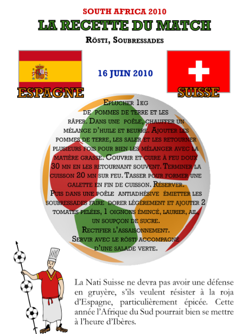 Chaque jour, le site www.merci-facteur.com, en partenariat avec Gérard Guy créateur de « la Cuisine des Poètes » et Jean Lapoujade, journaliste et écrivain de guides gastronomiques, publient « la recette du match » combinant les spécialités culinaires des deux pays s’affrontant sur le terrain ainsi que des commentaires sur le matches.