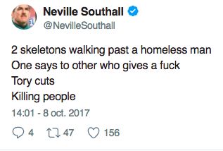 2 skeletons walking past a homeless manOne says to other who gives a fuckTory cuts Killing people