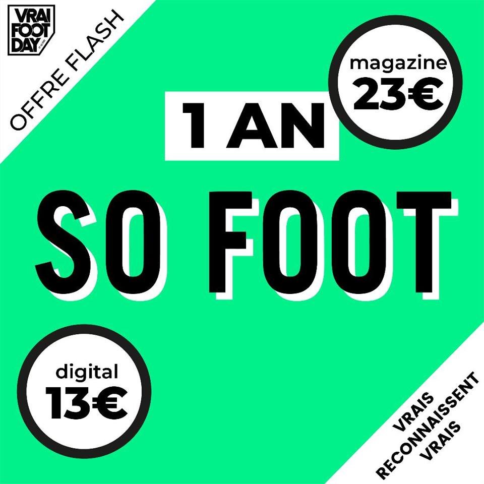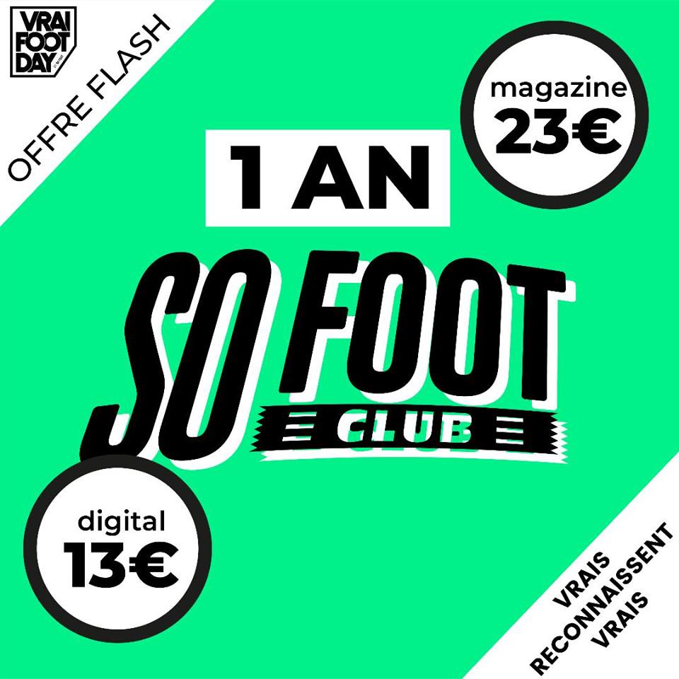 On va faire simple : tu as jusqu’à ce lundi soir pour profiter des offres d’abonnement mises en place dans le cadre du Vrai Foot Day. SO FOOT ou SO FOOT CLUB ou les deux ? Clique sur l’offre qui t’intéresse ci-dessous :