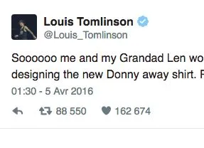 Le club de troisième division anglaise des Doncaster Rovers a mis à contribution ses supporters, en leur proposant de participer à un concours pour dessiner le maillot de l’équipe, pour la saison prochaine. Cinq maillots ont été sélectionnés dont un ensemble sombre, qui a récolté plus du tiers des suffrages. Mais, stupeur, lorsque les dirigeants des Rovers ont dévoilé l’identité du gagnant puisqu’il s’agit de Louis Tomlinson, l’un des membres des One Direction. Le chanteur, très impliqué dans la vie de son club de cœur, a posté un tweet mardi soir pour officialiser la nouvelle.