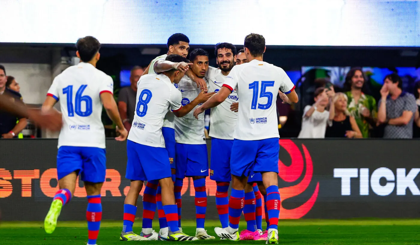Le Barça a corrigé son grand rival, le Real Madrid, lors d’un amical de prestige organisé au Texas (3-0). Un score très flatteur. Les hommes de Xavi ont attaqué pied au plancher, la volée d’Oriol Romeu venant fracasser la barre (4e). Trouvé par une passe lumineuse de Pedri, Ousmane Dembélé a ensuite transpercé Thibaut Courtois en décochant une frappe croisée surpuissante (1-0, 15e). Le Français a bénéficié d’un cadeau invraisemblable de Ferland Mendy pour s’offrir une nouvelle balle de but, mais le portier belge a remporté son face-à-face (41e). Le Real a aussi eu des munitions, et non des moindres. La main de Ronald Araujo a offert un penalty à la Maison-Blanche, que Vinicius a envoyé sur la transversale (20e). Le parfait résumé de la soirée du Brésilien, qui a touché la barre deux autres fois (39e, 87e).