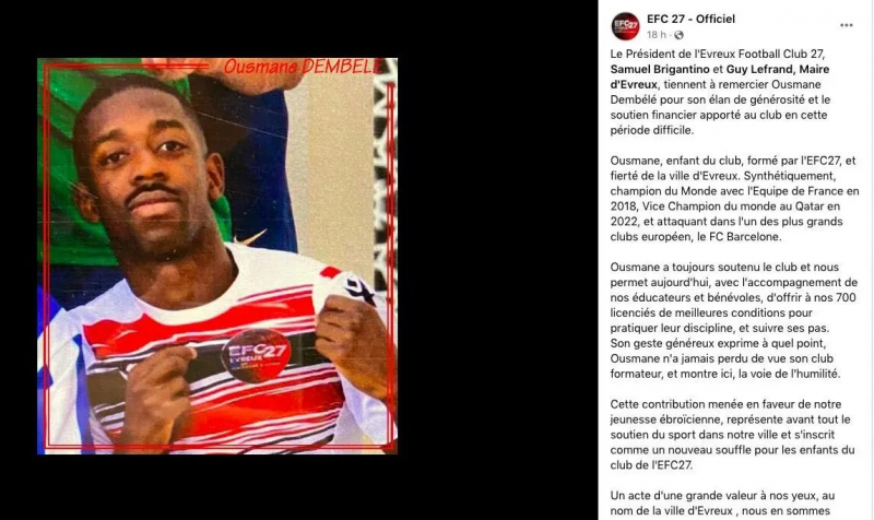 Ce samedi, Ousmane Dembélé a fait un don de 100 000 euros à son club formateur d’Évreux (qui est aussi celui de Dayot Upamecano), en grande difficulté financière depuis son accession en National 2, et pénalisé d’un retrait de trois points plus tôt dans la saison. C’est le maire de la commune normande, Guy Lefrand, et le président du club, Samuel Brigantino, qui l’ont annoncé et ont tenu à le remercier personnellement sur la page Facebook de l’EFC 27.