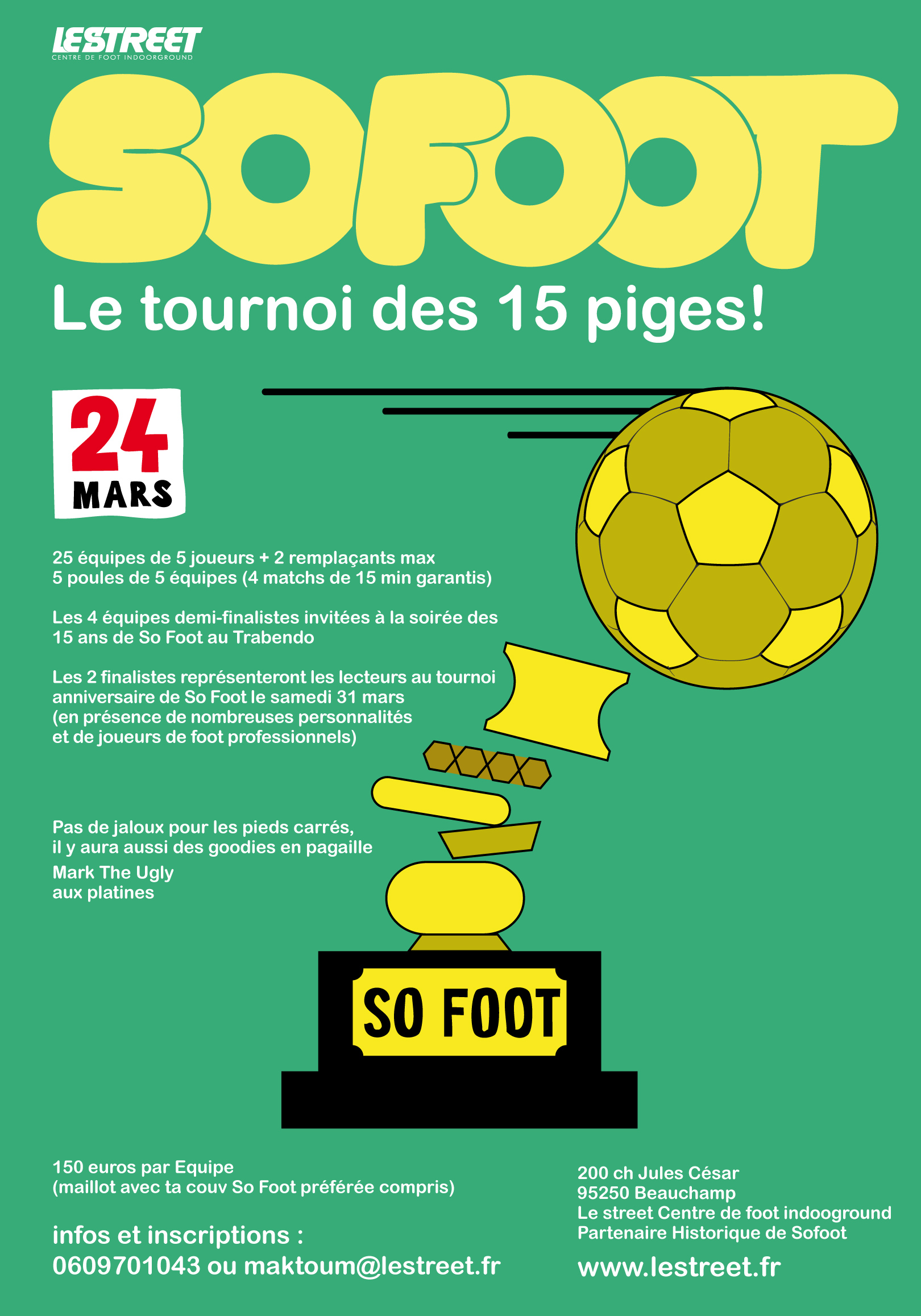 Où : au Street de Beauchamp (95) Combien ça coûte : 150 euros par équipe (T-shirts compris)Pour réserver : [email protected] ou 0609701043