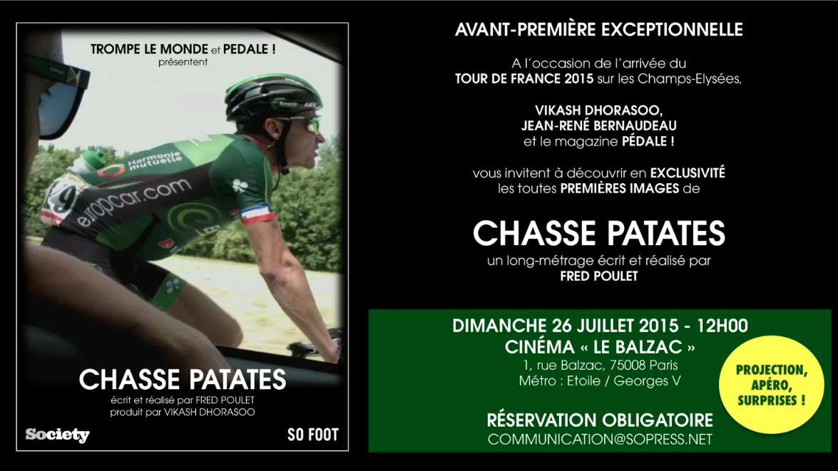 Dimanche prochain, nous organisons, avec le concours du meilleur magazine de vélo du monde, une projection un peu exceptionnelle, en attendant l’arrivée du Tour sur les Champs. Pour terminer la Grande Boucle 2015 en beauté, on a monté une projection privée du prochain film de Fred Poulet, en immersion au sein de l’équipe Europcar cette année, afin de suivre Jean-René Bernaudeau au cœur de la course, mais aussi à la recherche d’un repreneur. Le film s’appelle Chasse Patates, évidemment.