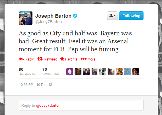 Étrange tweet que celui posté par Joey Barton hier soir. Visiblement calé devant le choc de la soirée en Ligue des Champions, Bayern Munich-Manchester City, le milieu de terrain s’est fendu d’une petite pique en direction d’Arsenal, dont personne ne comprend vraiment le parallélisme :